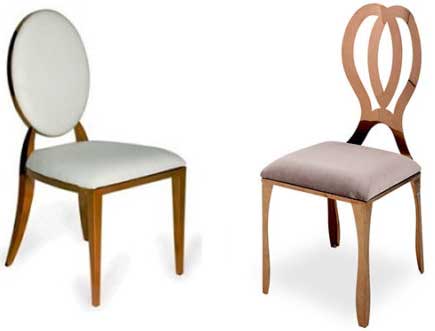 All chairs are available in with a Steel frame in Blue or Wine Fabric with Gold Powder Coated Finish with clear plastic guides to prevent floor scratching.